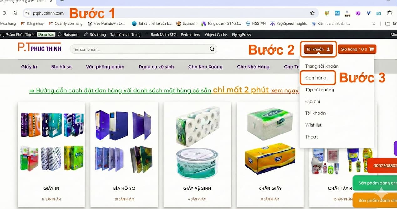 Bước 1, 2, 3: Truy cập vào website ptphucthinh.com, click vào mục “Tài khoản”, Chọn mục “Đơn hàng” trong danh sách menu.