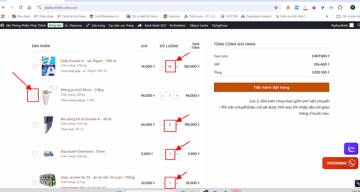 Bước 6: Tại danh Sách sản phẩm, bạn có thể linh hoạt: Tăng/giảm số lượng từng món. Xóa bỏ những sản phẩm không cần thiết trong lần đặt này.