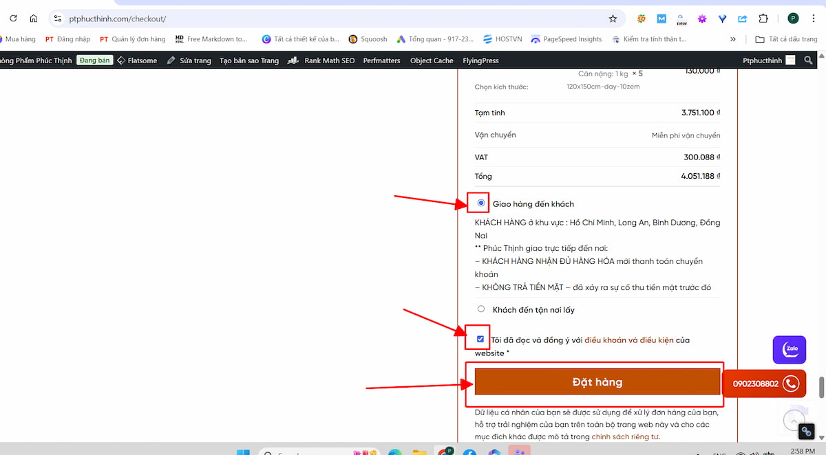 Bước 8: Chọn phương thức giao hàng, tích vào ô “Tôi đã đọc và đồng ý…”, sau đó nhấn “Đặt hàng” để hoàn tất.