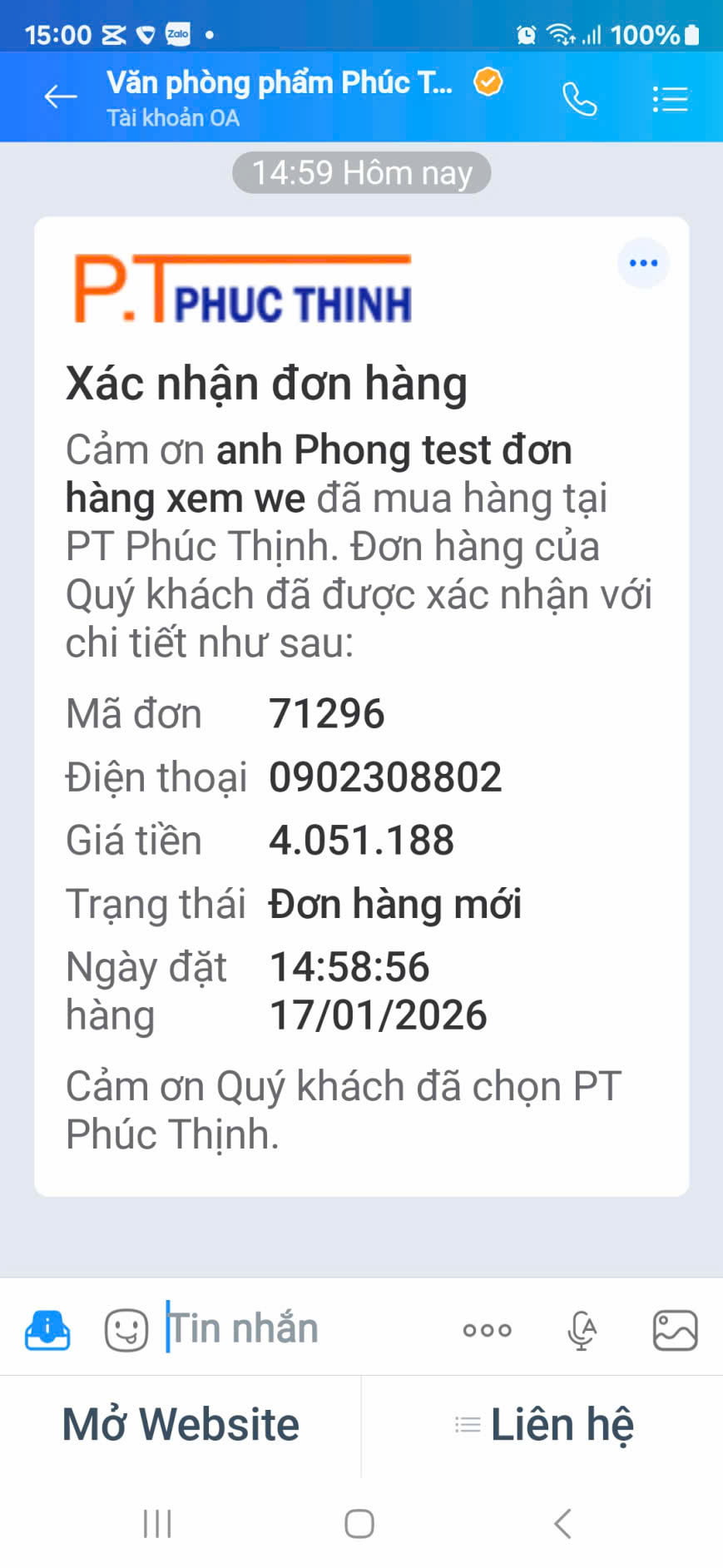 🔔 Đặc biệt: Ngay sau khi đặt hàng thành công, hệ thống sẽ gửi thông báo xác nhận chi tiết (Mã đơn, tổng tiền, trạng thái) trực tiếp về Zalo của bạn. Giúp bạn dễ dàng theo dõi và quản lý đơn hàng mọi lúc mọi nơi.